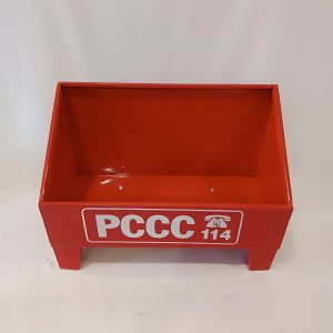 Mặt trước Kệ đựng 2 bình chữa cháy có dòng chữ “PCCC” và số điện thoại 114 – hotline cứu hỏa.